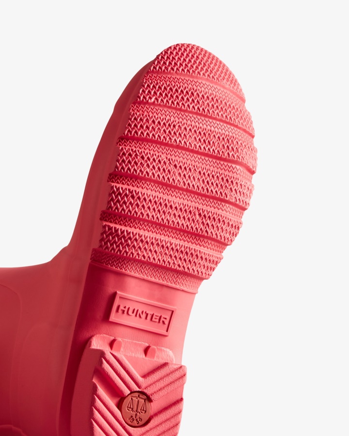 Size/Fit Summary: True to size,Regular fit.Note: This rubber color shares both red and pink based tones,in some lights it may appear a bright and fluorescent pink.Perfect for wet weather conditions this women's Rain Boot is a shorter version of the iconic Hunter Original Tall Boot. Formed of natural rubber,each boot is handcrafted and assembled over three days before being vulcanised for superior protection. Featuring the Hunter Original tread pattern,and an updated 100% recycled polyester lining and insole,this matte pink waterproof boot is a rainy-day necessity.We recommend that all Hunter boots be worn with socks to protect the wearer's skin from contact with rubber. All Hunter Boot Socks are specially designed for use with our boot range and feature a fold over top to cover the rubber and nylon boot edge,preventing any rubbing associated with wear.Certified veganWaterproofHandcrafted from 28 partsRecycled polyester lining and insoleRubber outsole with Hunter Original tread patternCrafted from natural vulcanised rubber with matte finish