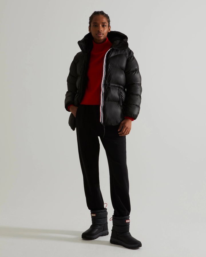 Size/Fit Summary: True to size,Regular fit. Slimmer fit on arms. Model is 176cm / 5' 9?" and is wearing a size S. Centre back measurement for Size S is 25.1" (64cm) and sleeve length from shoulder point is 24.8" (63cm).Note: This Puffer Jacket has been fully padded for optimum warmth,so it may retain a stiffer shape on some figures.We've made two tweaks to our bestselling vegan Women's Rubberized A-Line Puffer Jacket to make it even more sustainable. The soft,padded insulation is made from upcycled recycled plastic bottles and the lining is crafted from recycled polyester. With a water-repellent rubberized shell,this black jacket will keep you warm in temperatures as low as -25 degree celsius(-13 degrees Fahrenheit).Certified veganWater-resistantShell fabric has a light polyurethane coating for a rubber touch feelHighly insulated using eco-friendly filling made from recycled plastic bottlesFleece lined hood for added warmthFront zip pockets with knuckle side liners for added warmthCentre front Hunter branded zipInternal chest pocket with zip closureConcealed elasticated gaiter on cuffs for added warmthBungee drawcords at waist and hood for adjustabilityCan be worn in temperatures as low as -25 degree celsius(-13 degrees Fahrenheit)