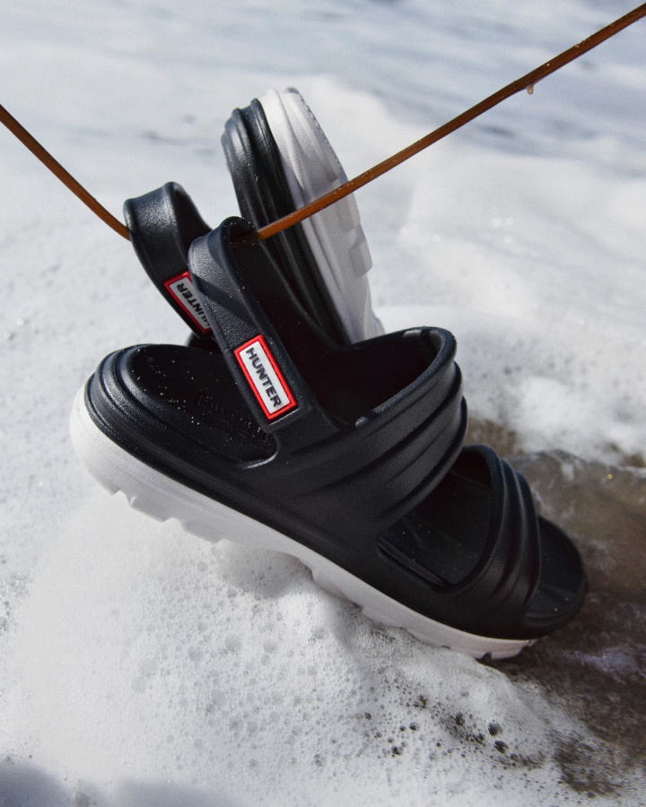 Size/Fit Summary: True to size,Regular fit.Protection,whether that's from the elements or of nature,is at the heart of Hunter. This season,we are excited to introduce a revolutionary new material produced from algae. When algae grows in excess,it can be harmful to ecosystems,so the algae in this material was sourced by cleaning up natural waterways. Our new Women's BLOOM? Sandal is crafted from a blend of our familiar lightweight blown EVA and this innovative material. This black and white sporty sandal from our injection moulded summer footwear range has adjustable straps and a chunky,durable tread for extra grip on all-terrains.Certified veganLightweightFully moulded styleAdjustable Velcro strapLight contouring on footbed for comfortEasy to clean and quick dryCrafted using BLOOM? Algae which helps reverse the effects of water pollution